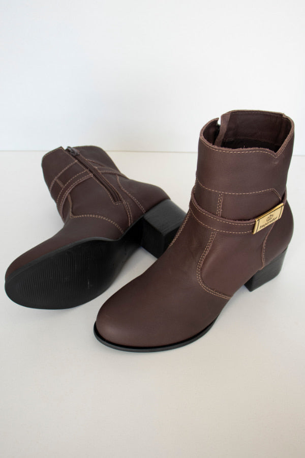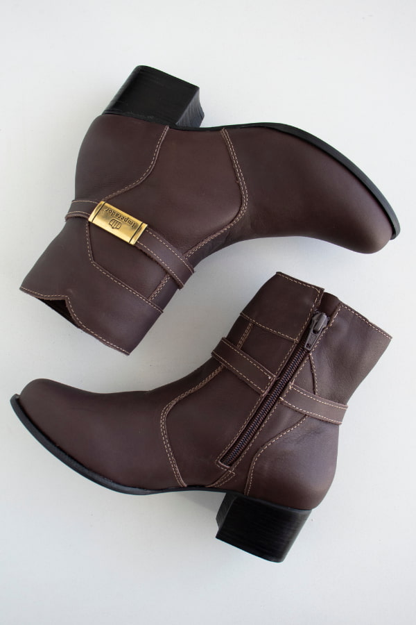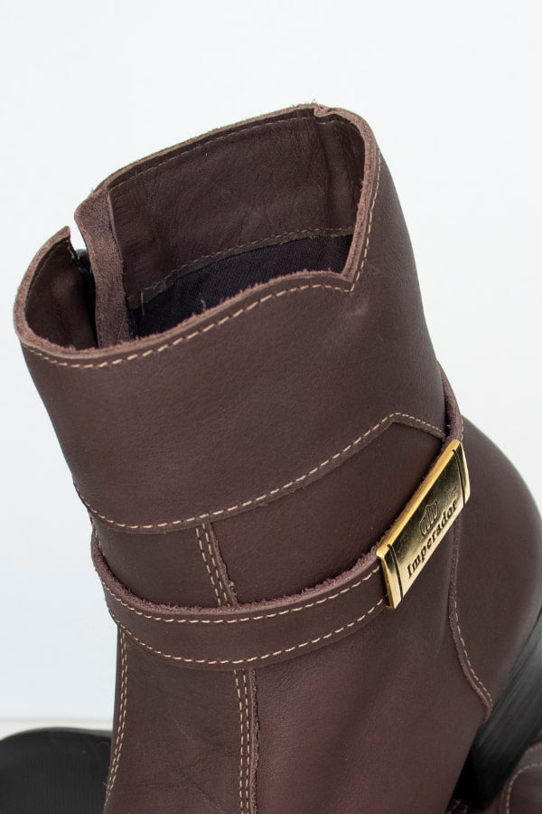 A Bota Feminina Realeza em Couro Café possui solado em borracha com salto em couro de 4,5 cm, costurado e colado para maior resistência. Conta ainda com costuras reforçadas, estrutura de calcanhar firme e garantia de 1 ano. Um modelo que traduz o equilíbrio perfeito entre elegância, conforto e durabilidade, assinando o estilo autêntico e refinado da linha Imperador.